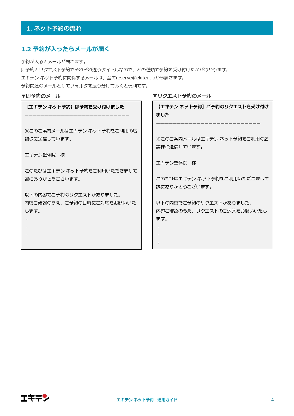 「【エキテン ネット予約】リクエスト予約を受け付けました(要対応)」 という件名のメールをご確認ください。