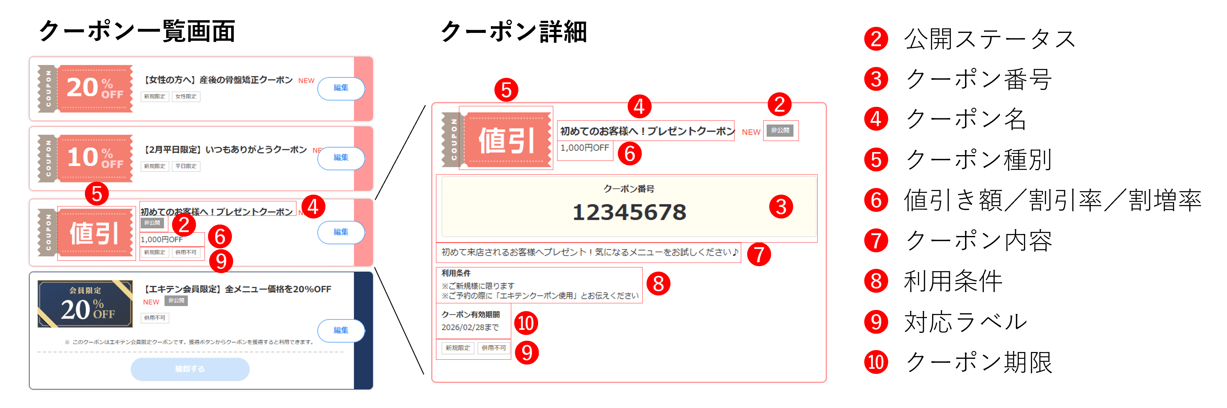| ❷ | 公開ステータス【必須】 | 公開・非公開を選択できます。 ※編集モードを解除すると、クーポンごと非公開になります ※非公開で登録して見た目を確認し、問題がなければ公開にすることも可能です |